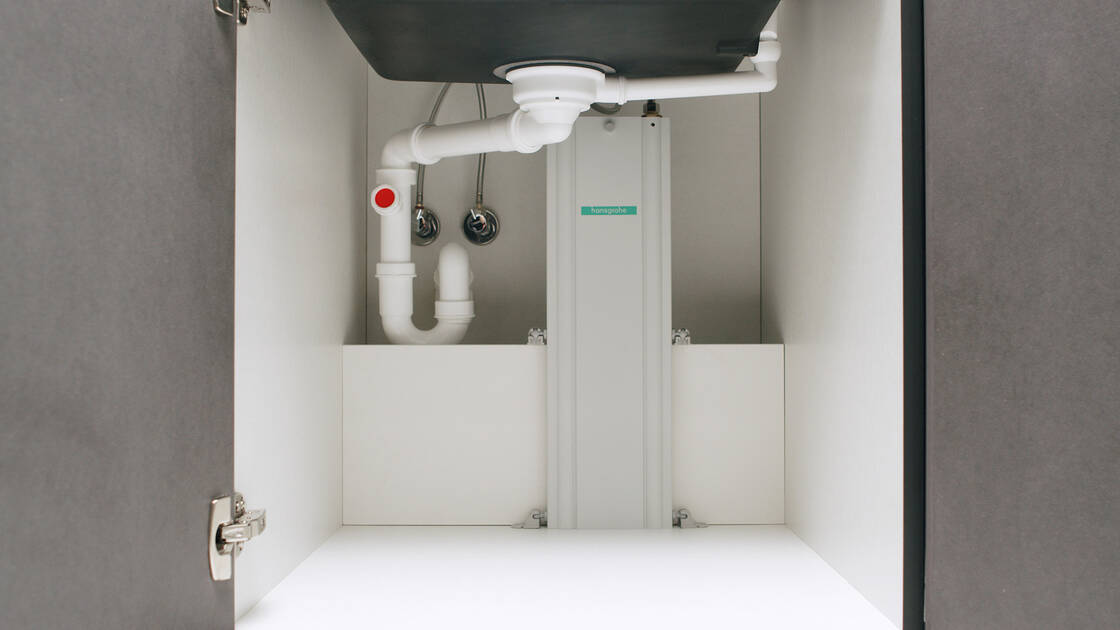 Souvent, sous l’évier, un flexible librement suspendu peut se heurter aux détergents, poubelles ou autres. Cela gêne d’une part le bon fonctionnement du flexible et peut d’autre part endommager l’endommager. Vérifiez donc si vous pouvez faire de la place dans le meuble bas ou installez notre guidage de flexible sécurisé sBox. Celle-ci protège le flexible extractible et veille à ce que tout fonctionne sans problème.